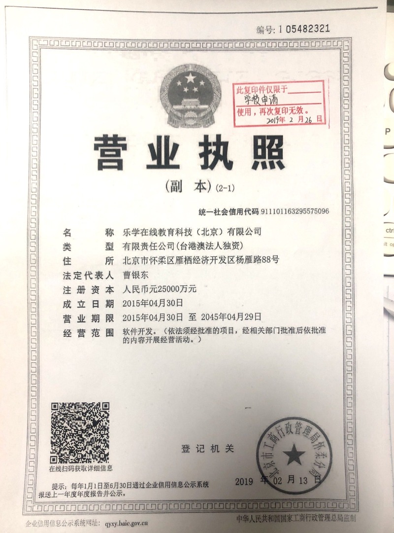 北京乐学教育集团(以下简称“集团”)是一家面向K12领域的科技型教育公司,由全球最大教育公司学而思教育集团(股票代码:TAL)现已更名为好未来教育集团(tal)联合创始人曹允东先生于2014年12月创办。 [1]