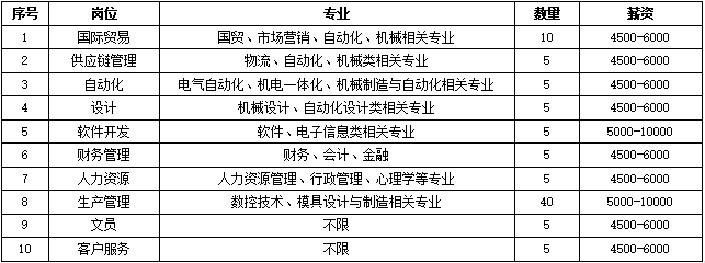 招聘专业及人数:电气自动化技术:5人,电子信息工程技术:5人,工业机器人技术:5人,机电一体化技术:5人,模具设计与制造:5人,商务英语:5人,数控技术:10人,物流管理:10人,