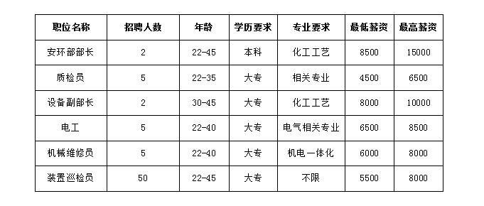 招聘岗位:车间主任、技术员、生产装置操作工、电工仪表工、机械维修工、安全员、分析化验员、储运人员及其他岗位。石油、化工、化学、煤化工、催化、电气等相关专业。