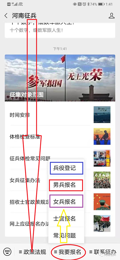 关注并进入微信公众号“河南征兵”,点击下方正中“我要报名”