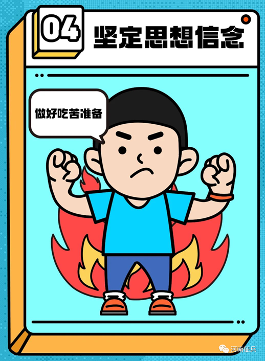 军营是淬火加钢、为国效力的地方,小伙伴们在应征前应该做好在部队吃苦磨炼的准备。参军入伍,是为了保家卫国,不是个人英雄主义,也不是一时的头脑发热。需要有坚定的信念,勇于承担责任。